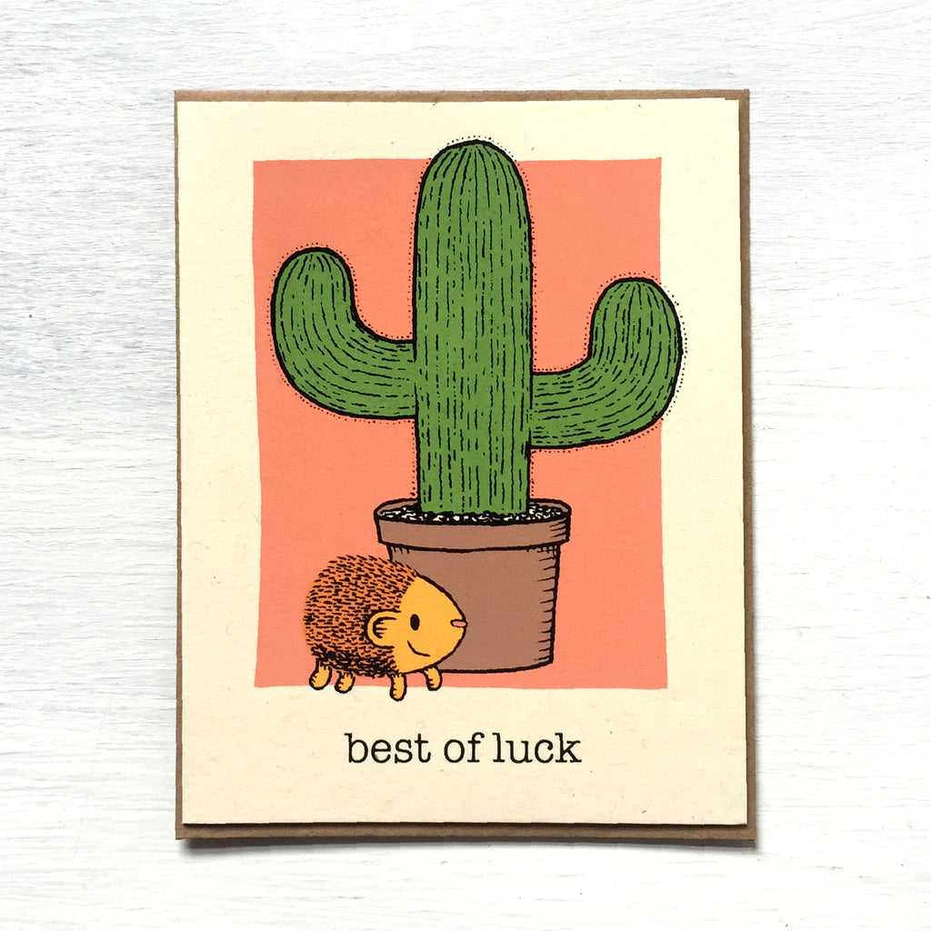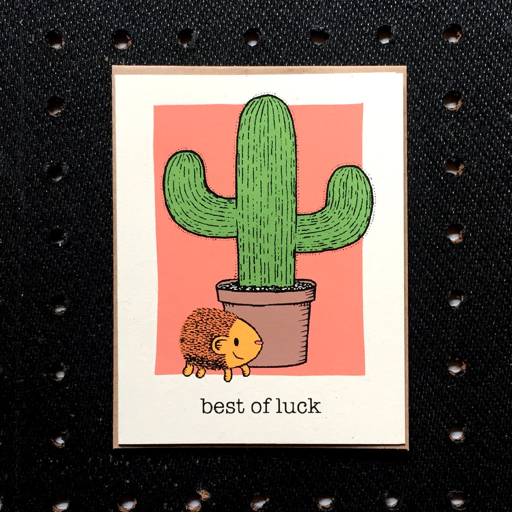 This hedgehog and cactus card was printed on off white paper with green, yellow, coral and black ink.