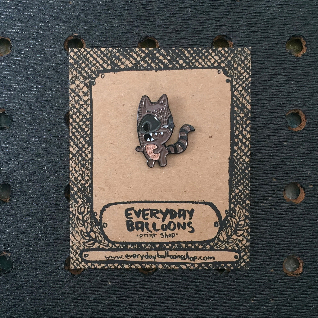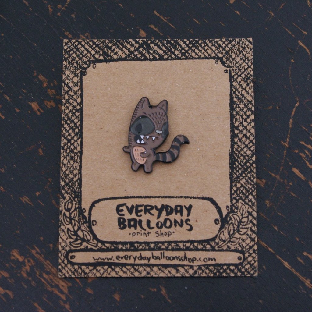 this cute enamel pin is certain to brighten up your bag or jacket. it is approximately 1" in size and comes with a screen printed cardboard backer. buy two and pass one on to another raccoon lover in your life.