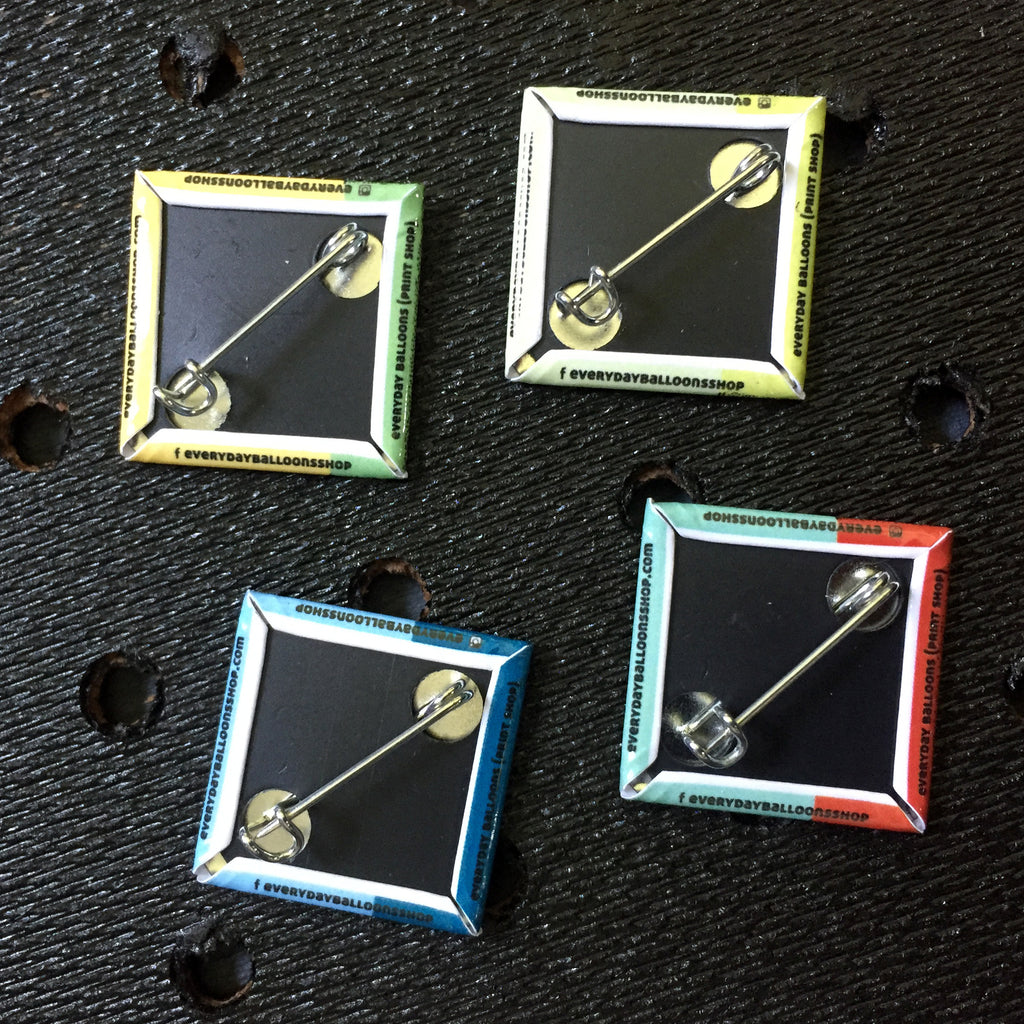 1" square pin-backed buttons. Created from our original illustrations and made in the USA.