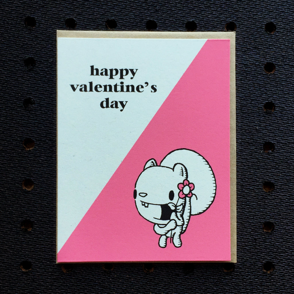 Cute squirrel valentine card printed on off white paper with pink and black ink.